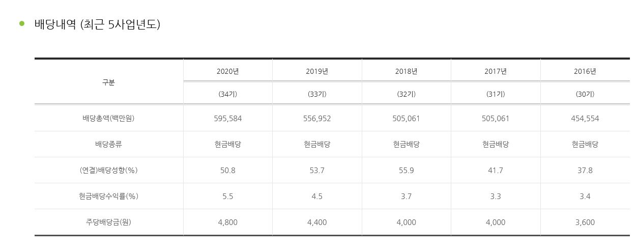 16년 3,600원을 시작으로 2020년엔 4,800원까지 약 5년만에 33%의 배당성장이 이루어졌네요.