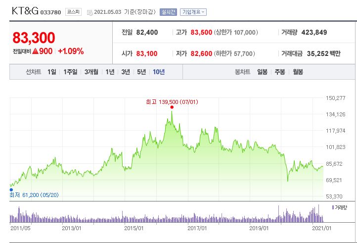 KT&G의 10년간 주가추이를 살펴보면 아쉽게도 우상향하는 모습은 아닙니다.