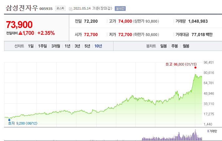 삼성전자우의 10년 주가추이를 보면 아주 아름다운 우상향을 보여주고 있습니다.