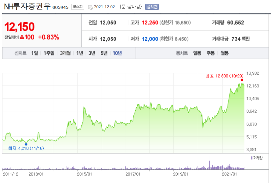 nh투자증권우의 경우는 nh투자증권보다 배당금을 더 주고 있는데요,