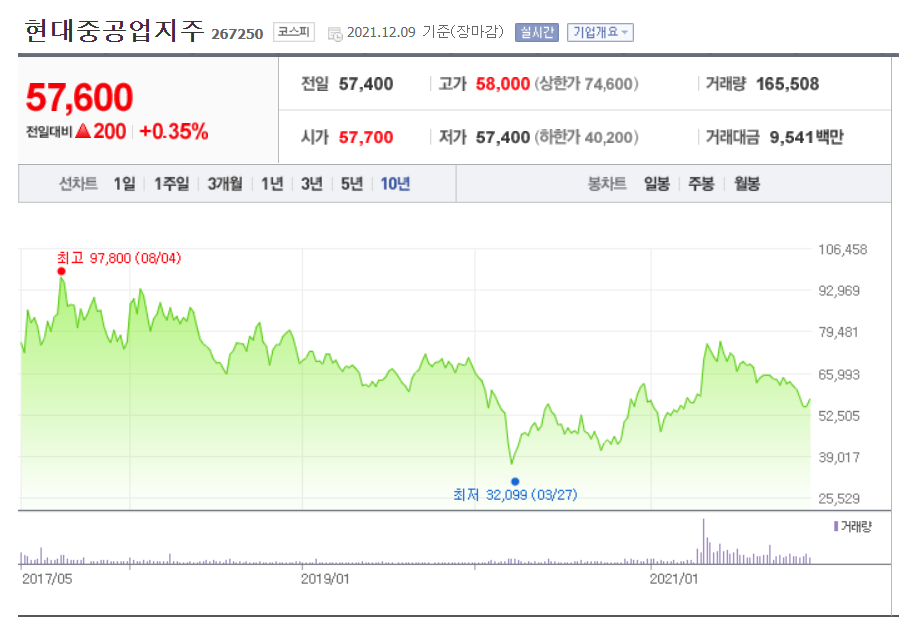 현대중공업지주의 10년주가추이를 보면 우하향을 보이고 있습니다.