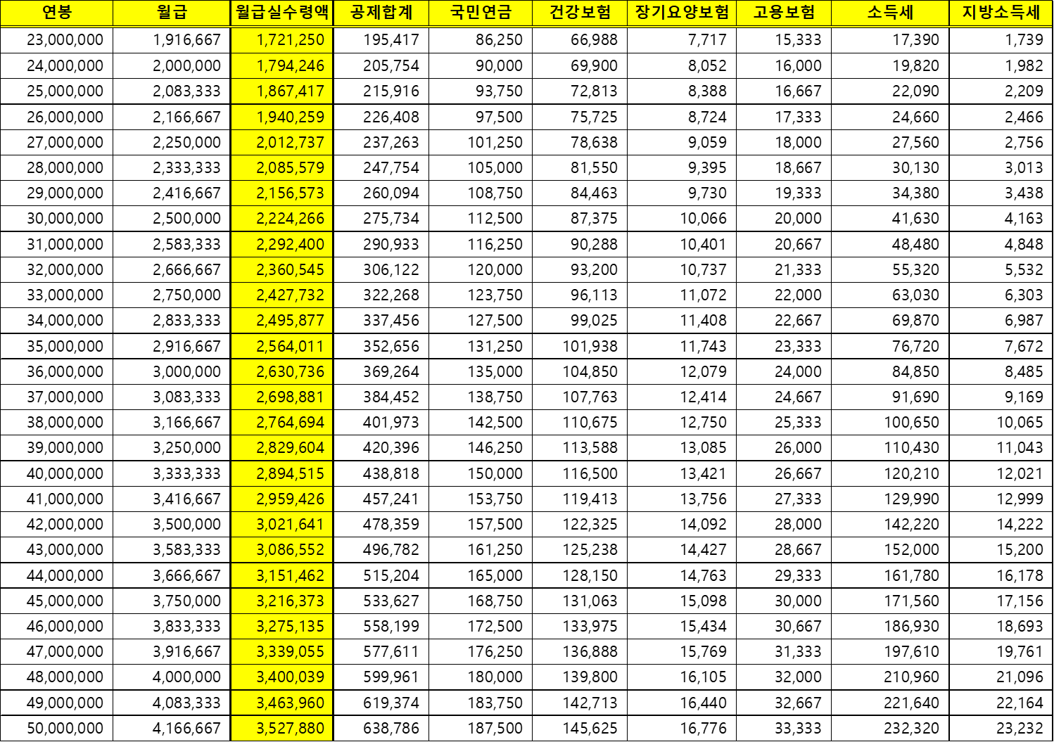 1) 연봉 2,300 ~ 5,000만원 월급 실수령액