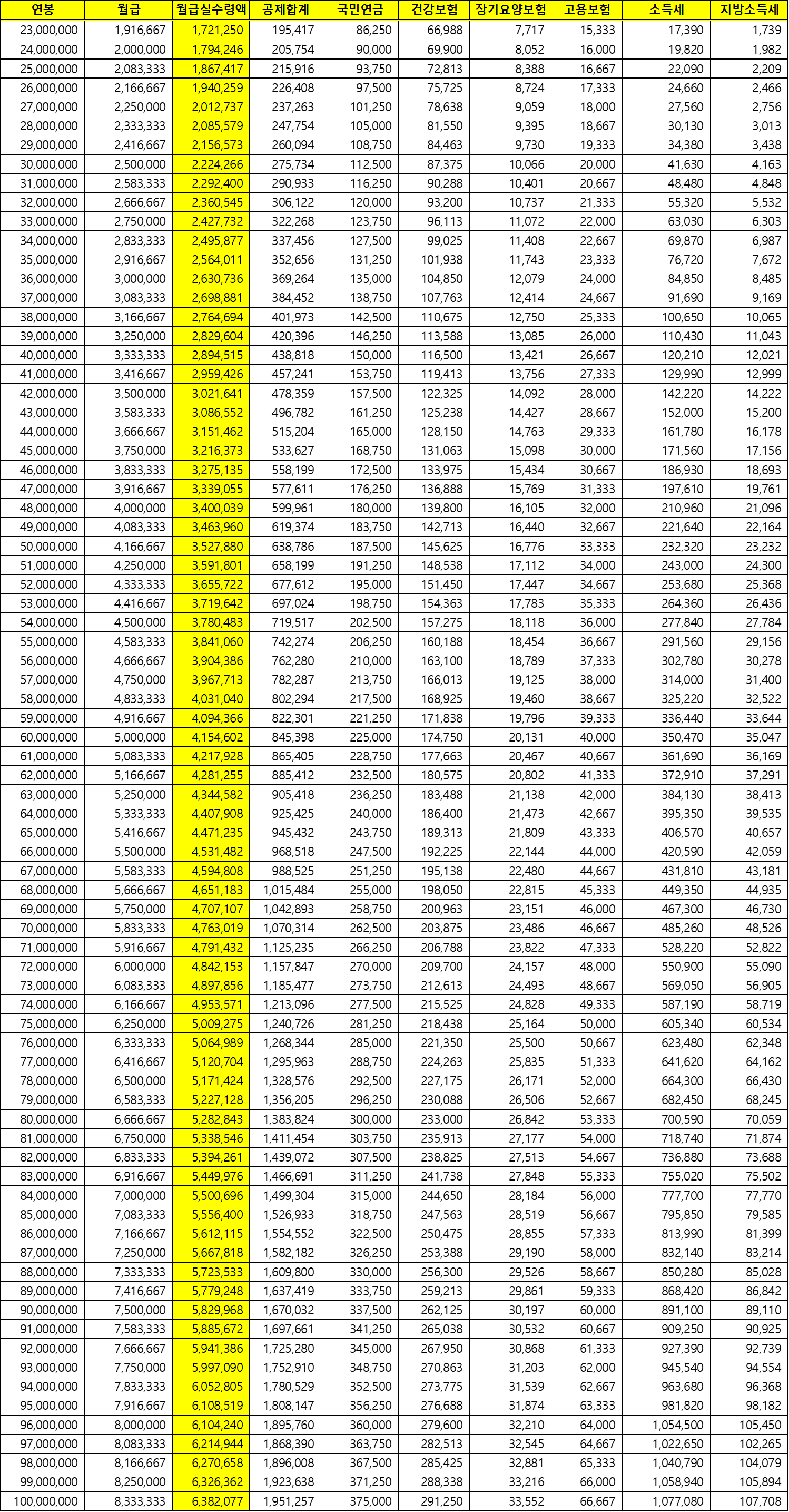 아래의 표는 2022년 예상되는 연봉 실수령액입니다.
