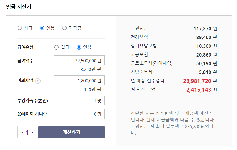 이때는 다음에서 '연봉 계산기'이라 검색하여 연봉실수령액을 검색하면 됩니다.