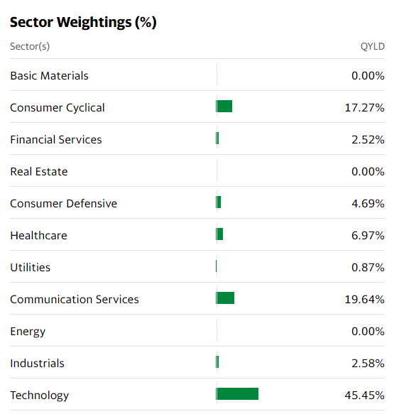 보시는바와 같이 QYLD는 거의 절반가량을 Tech주식으로 채우고 있고