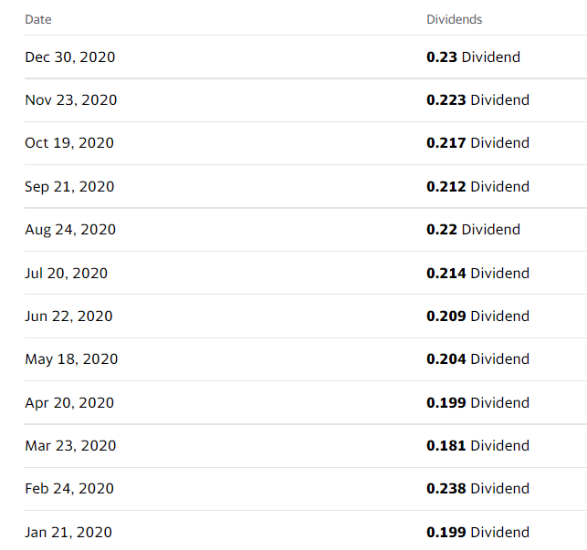월마다 꾸준히 0.2달러정도 주다가 연말에 갑자기 1달러의 배당을 지급한관계로 연 배당수익률이 크게 늘어났는데요.
