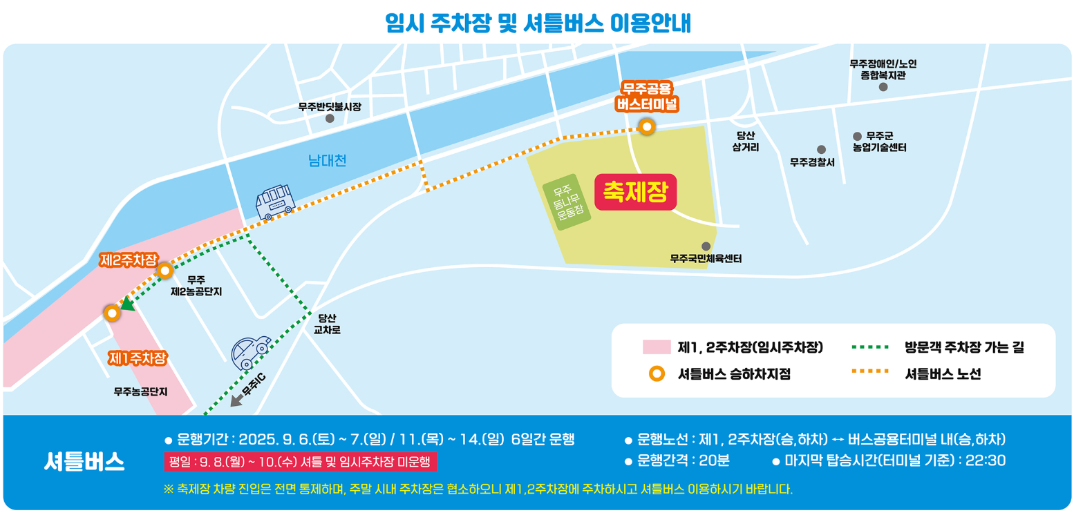 셔틀버스: 축제 기간 중 무주읍 시내 ↔ 주요 행사장 운행 (운행 시간 확인 필수)